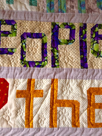 ReplyDeleteWow!!! This is wonderful and such a nice sentiment too. A quilt I'm sure you'll cherish for the quote and all the blocks made by quilty friends. I really like how you quilted through the letters kind of like cursive. I didn't join this bee but then ended up asking for letter blocks when my turn came in the Mid Century Bee so one day Ill have a word quilt too. No immediate plans though so it will be awhile.